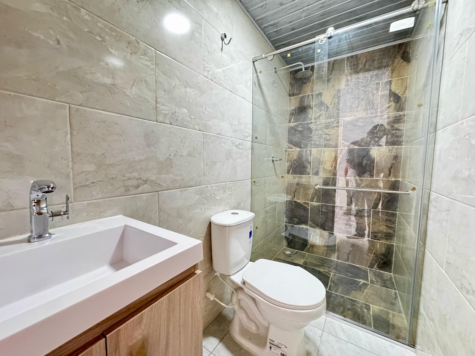 Baño con divisiones en vidrio templado.